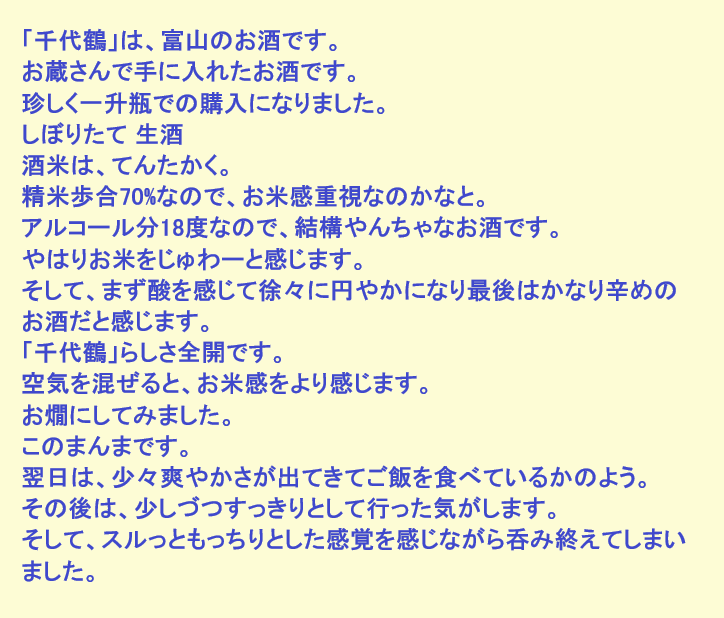 新しく開けたお酒:千代鶴(富山)