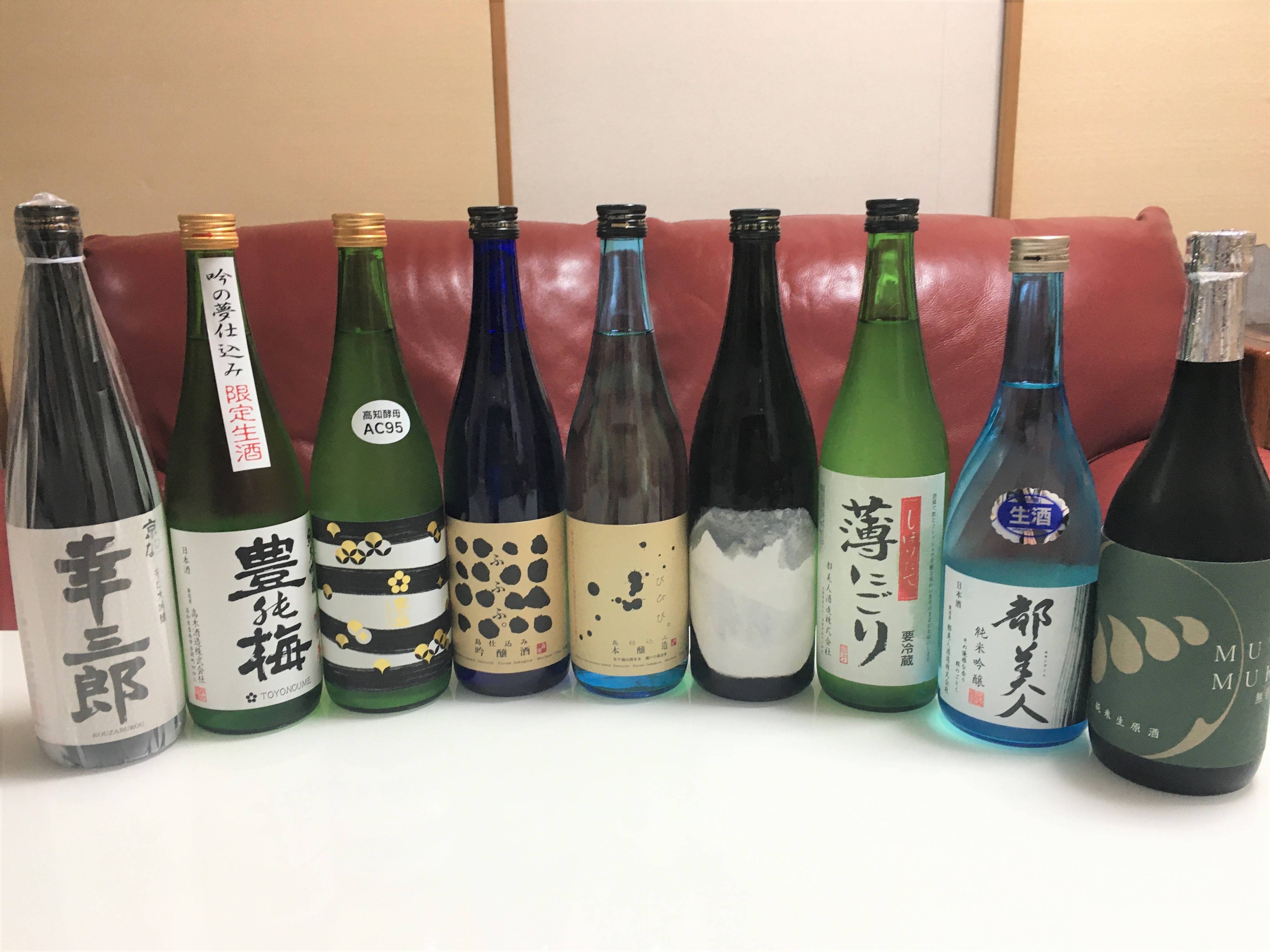 ※左から 今ひな(愛媛)×1、豊能梅(高知)×2、ふふふ(小豆島)×1、びびび(小豆島)×1、酔鯨(高知)×1、都美人(淡路島)×2、無手無冠(高知)×1