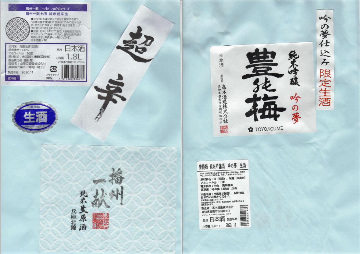 「酒の間」の山陽盃酒造「播州一献」ラベルと高木酒造「豊能梅」ラベルに追加しました。