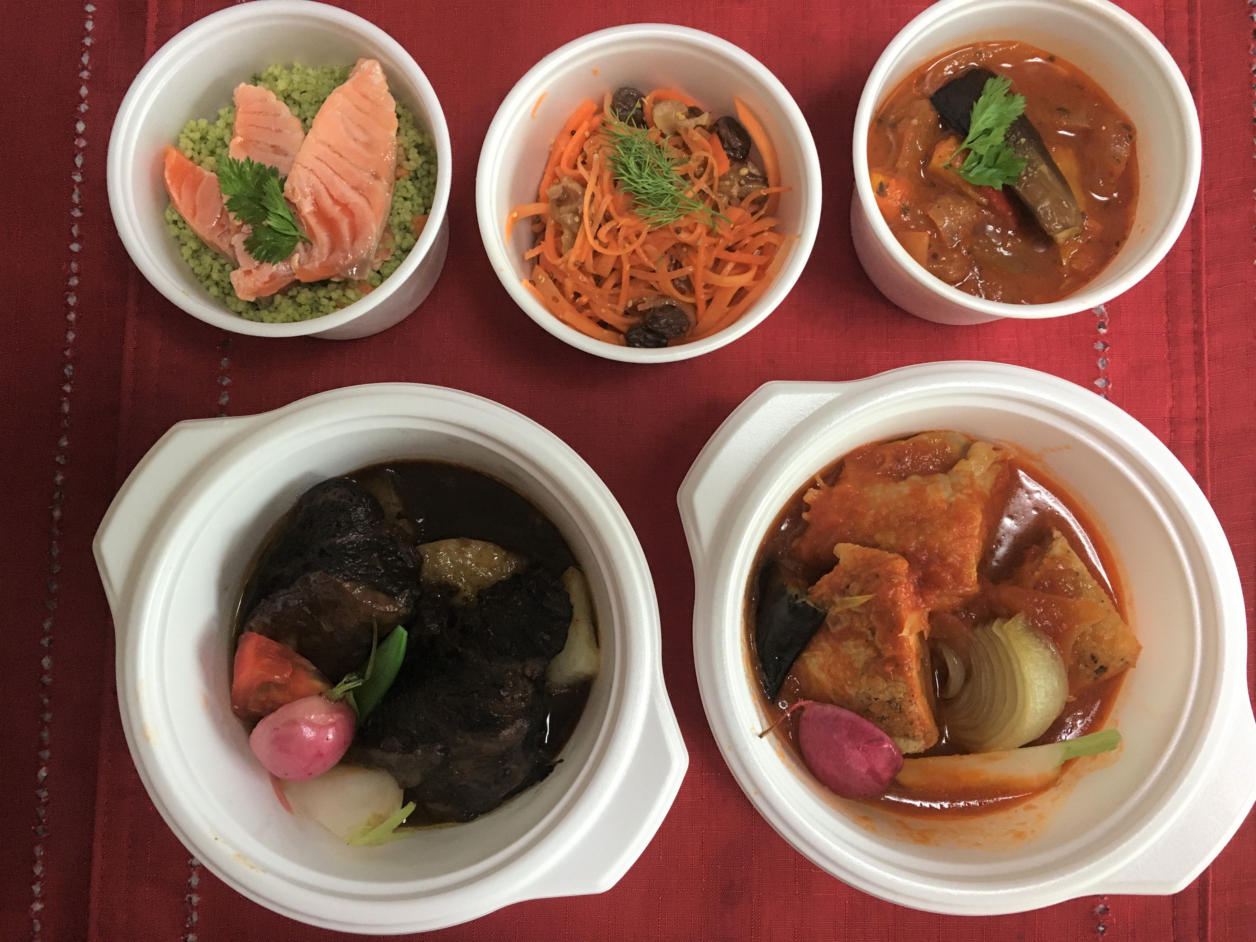 炙ったサーモンと旬菜のクスクス 胡桃とレーズンのキャロットラペ 5種野菜と山椒のラタトゥイユ 葡萄牛と赤ワインの煮込み グラタンドフィノワ添え 総州古白鶏のトマト煮込み 新玉ねぎのロースト添え