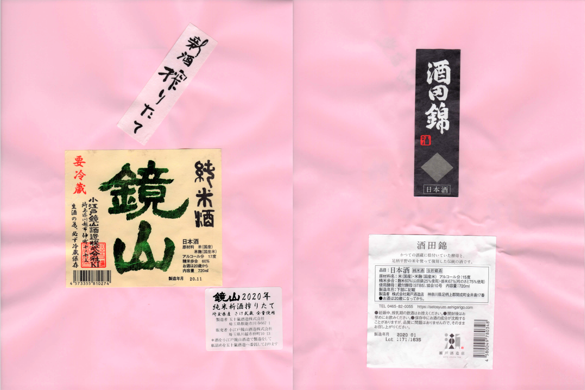 「酒の間」の小江戸鏡山酒造「鏡山」ラベルと瀬戸酒造「酒田錦」に追加しました。