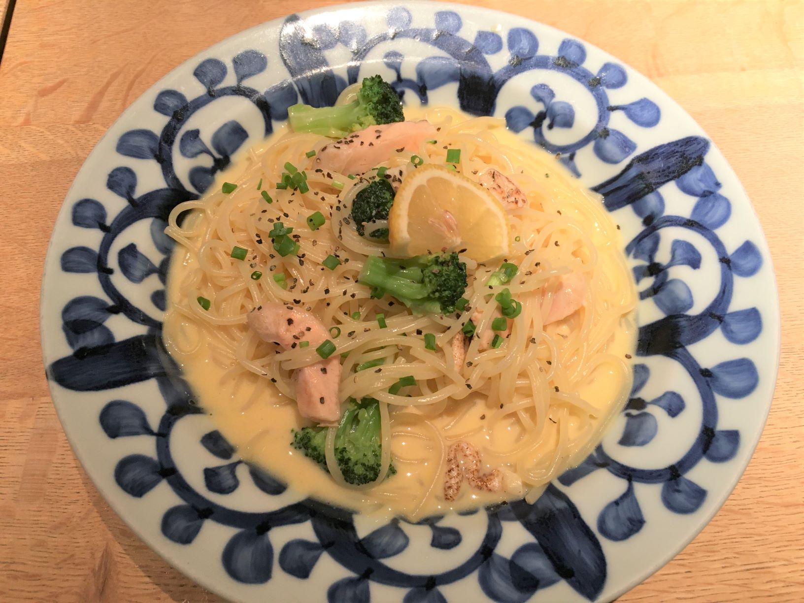 パスタは、炙りサーモンのレモンソースパスタ。