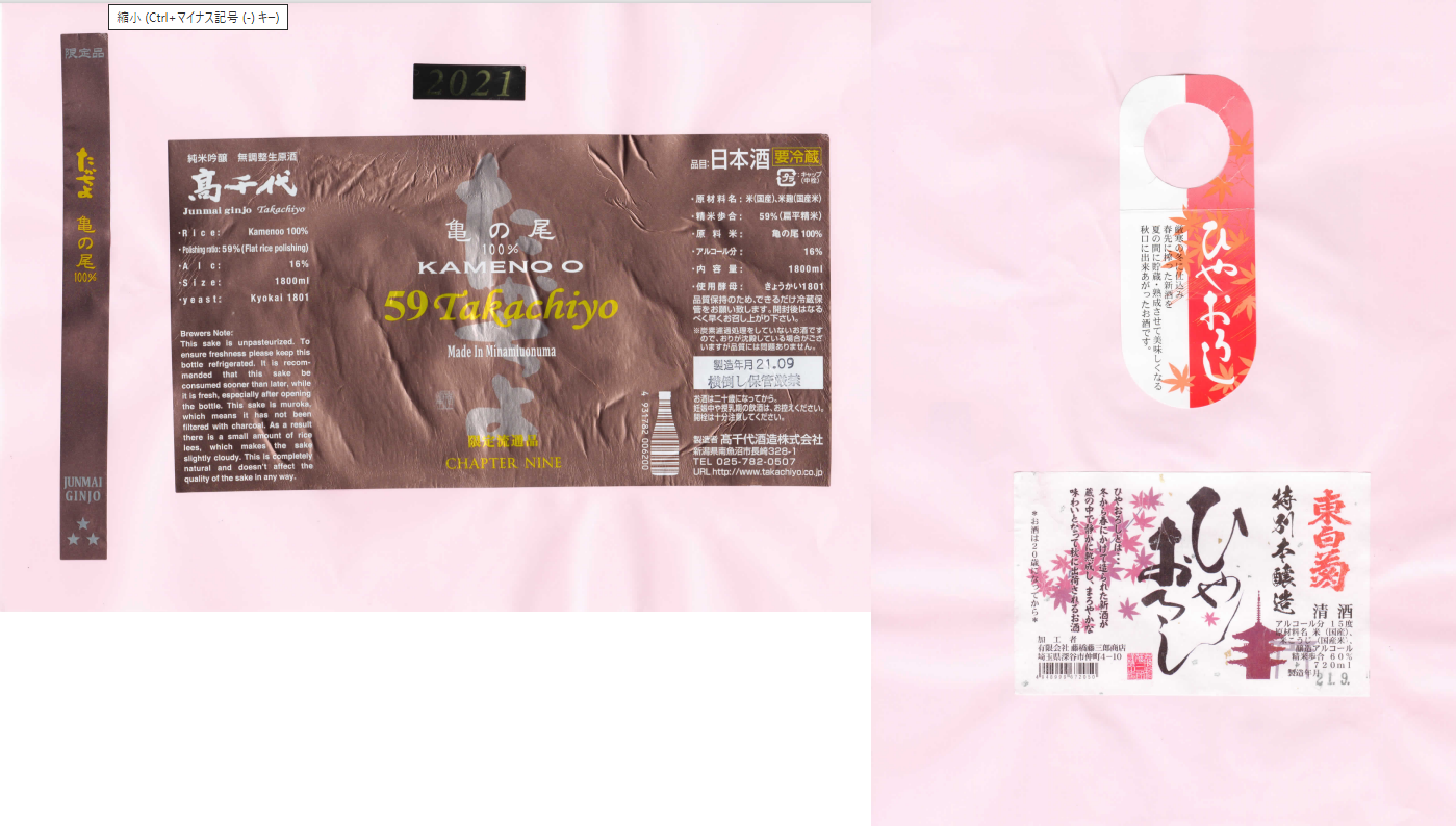 「酒の間」の高千代酒造「たかちよ」ラベルに追加、藤橋藤三郎商店「東白菊」ラベルを追加しました。