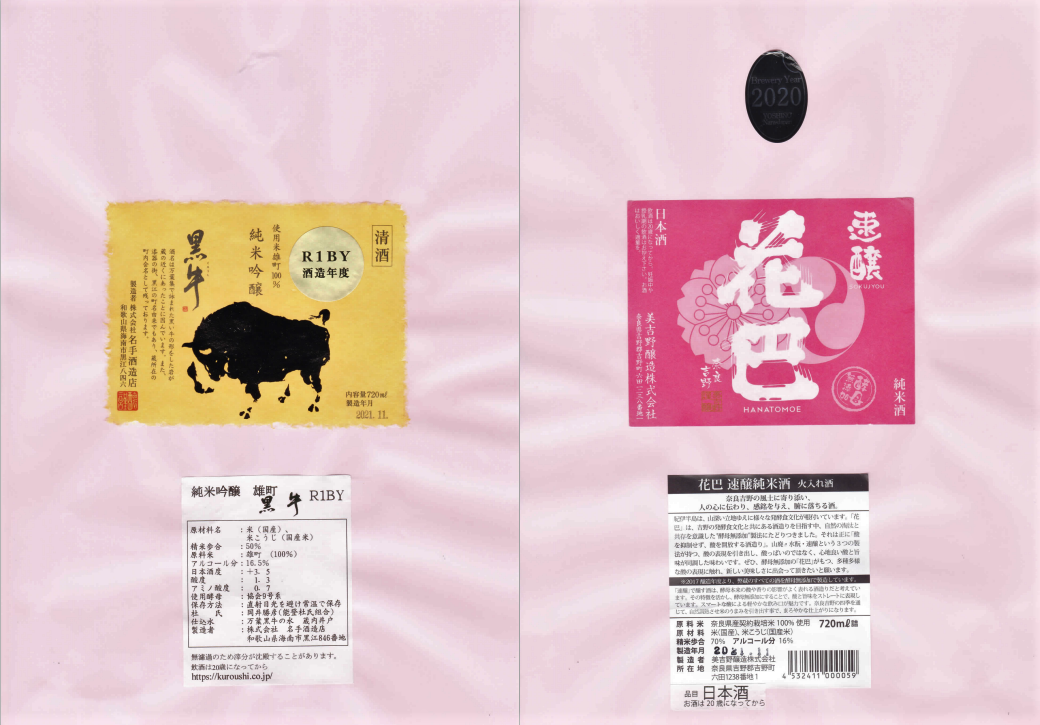 「酒の間」の名手酒造店「黒牛」ラベルと美吉野醸造「花巴」ラベルに追加しました。