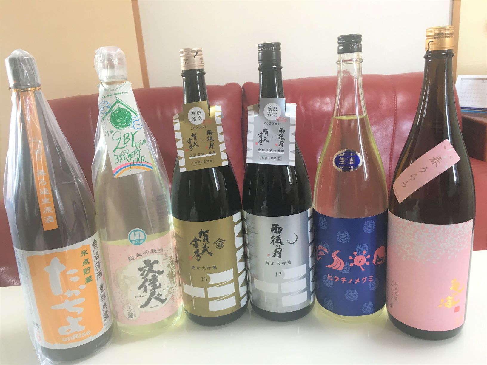 ※左から たかちよ・文佳人・賀茂金秀×雨後の月コラボ酒2本・結ゆい・亀の海