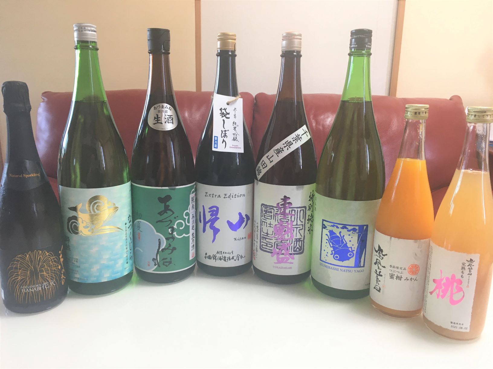 ※左から 花の香・酔鯨・あづまみね・帰山・東魁盛・いづみ橋・鳳凰美田(みかん・桃)