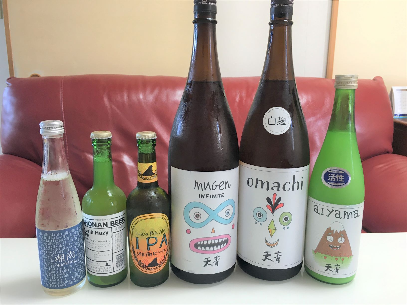 ※左から スパークリングの日本酒・クラフトビール2本・酒未来のお米で造った天青・雄町のお米と白麹で造った天青・愛山のお米て造った活性酒の天青