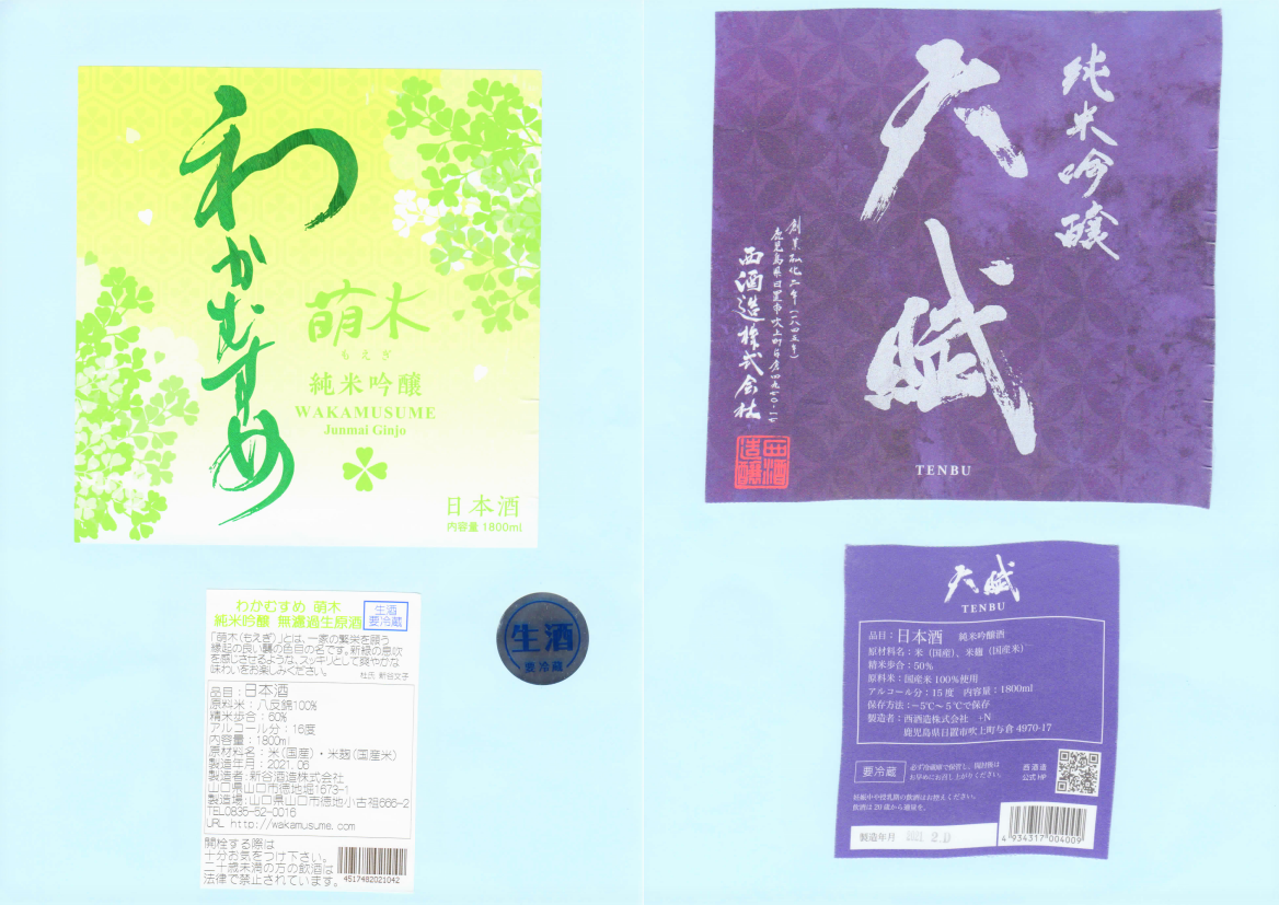 「酒の間」の新谷酒造「わかむすめ」ラベルと西酒造「天賦」ラベルを追加しました。