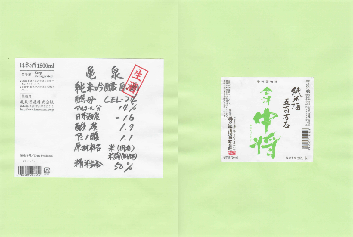 「酒の間」の亀泉酒造「亀泉」ラベルに追加、鶴乃江酒造「会津中将」ラベルを追加しました。