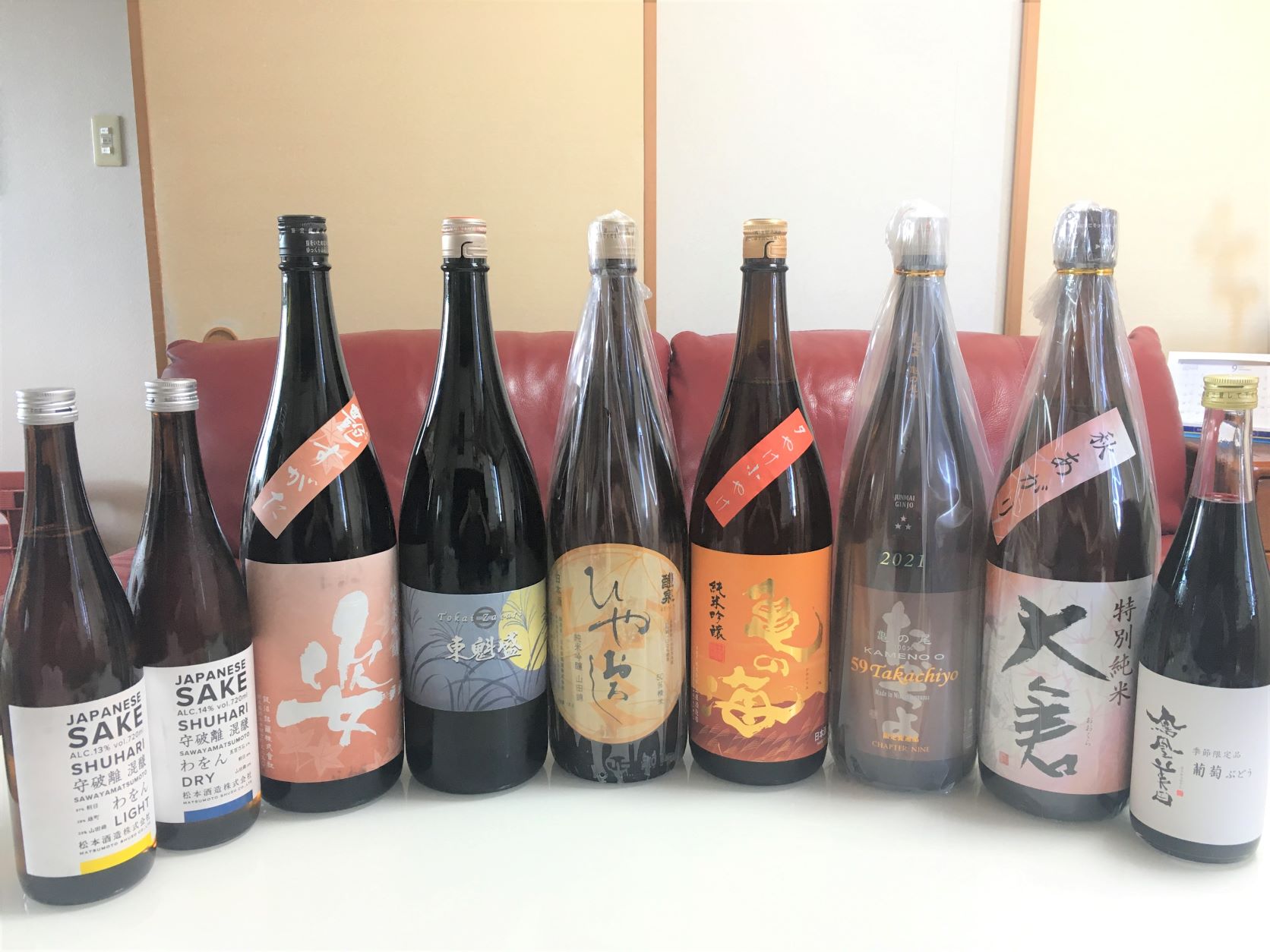 ※左から まつもと×2・姿・東魁盛・醴泉・亀の海・たかちよ・大倉・鳳凰美田(ぶどう)