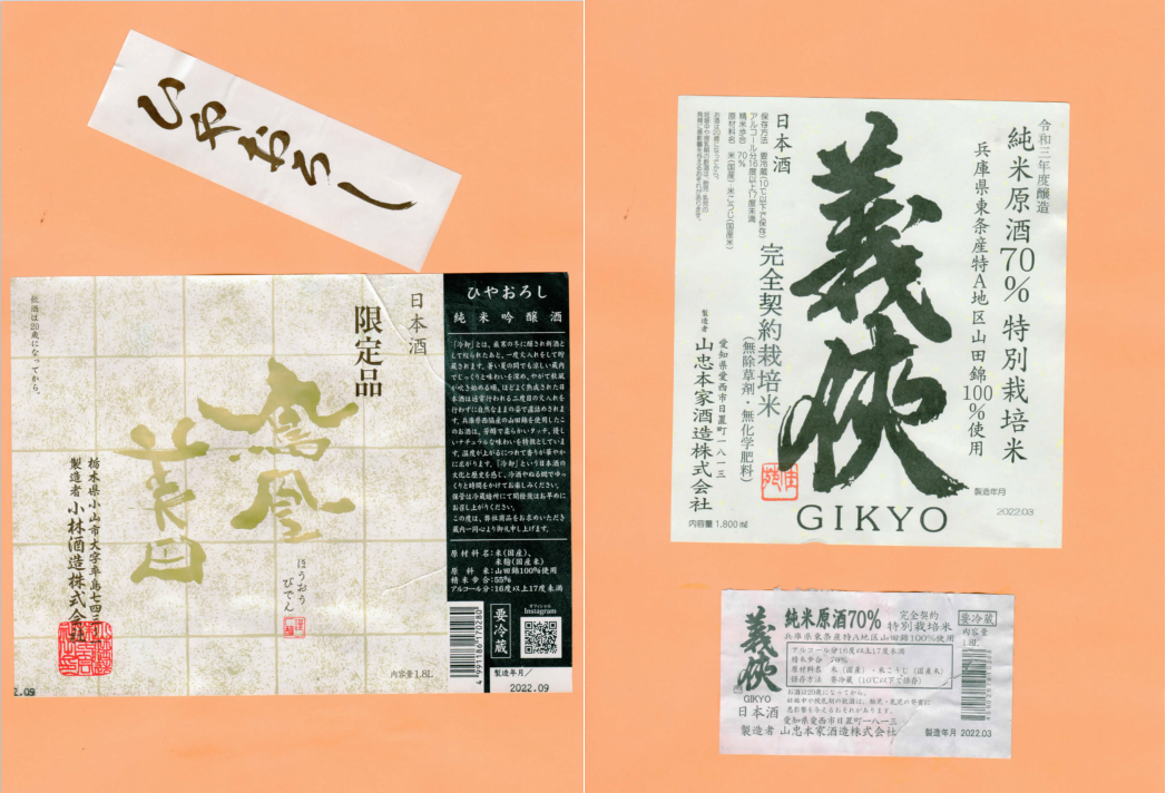 「酒の間」の小林酒造「鳳凰美田」ラベルと山忠本家酒造「義侠」ラベルに追加しました。