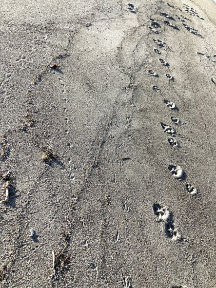 浜辺を歩いていたら、鳥と犬の足跡ランデブーを見つけました。