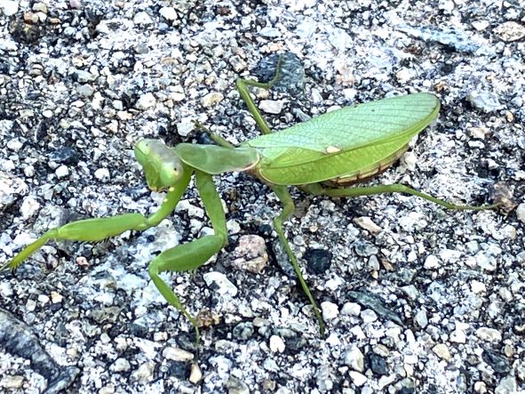 海岸の遊歩道を歩いていたら遊歩道をカマキリが海に向かって歩いていました。
