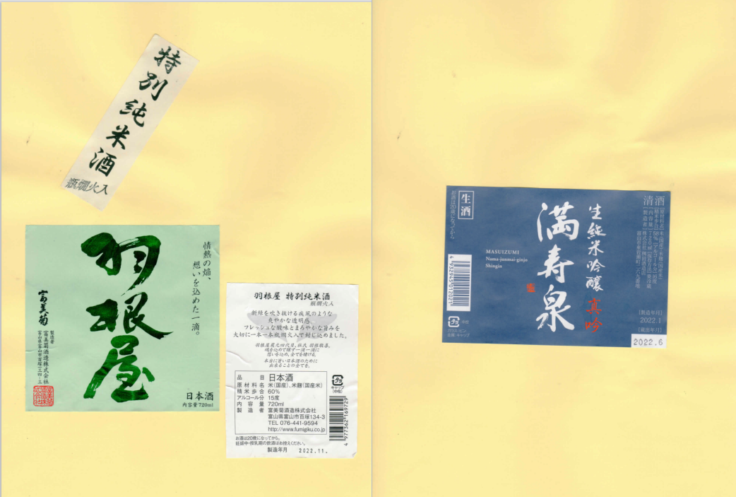 「酒の間」の富美菊酒造「羽根屋」ラベルと桝田酒造店「満寿泉」ラベルに追加しました。
