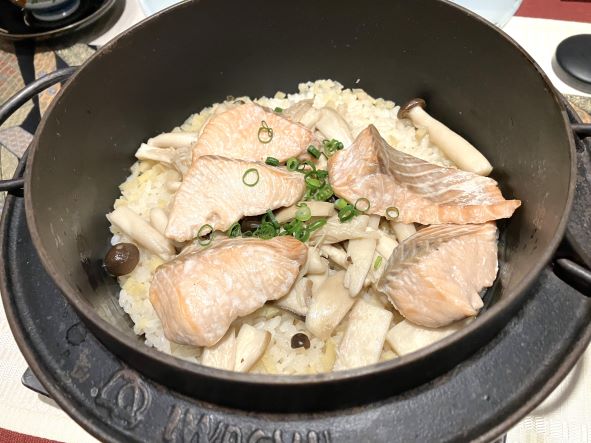 いわて純情プレミアムひとめぼれを使用した秋鮭茸の炊込みご飯。