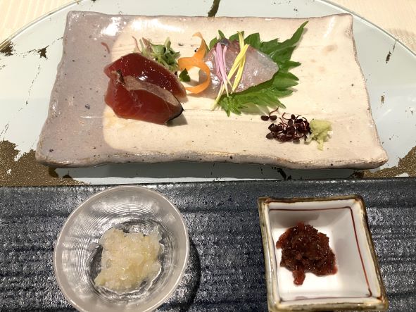 炙りカツオ藁焼き酒盗醤油〆と高知県直送かんぱち。