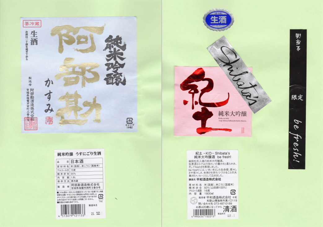 「酒の間」の阿部勘酒造「阿部勘」ラベルと平和酒造「紀土」ラベルに追加しました。