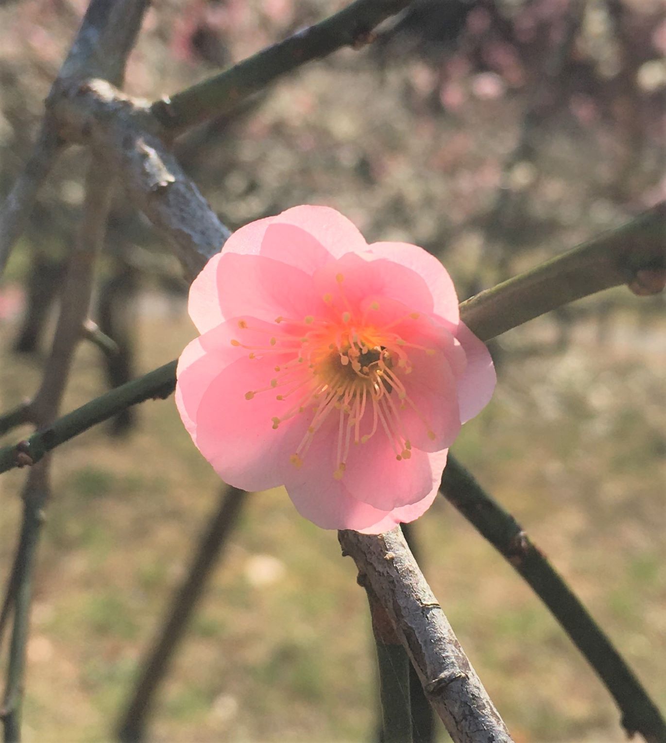 しだれ梅のようにも見える真っ赤な梅です。
