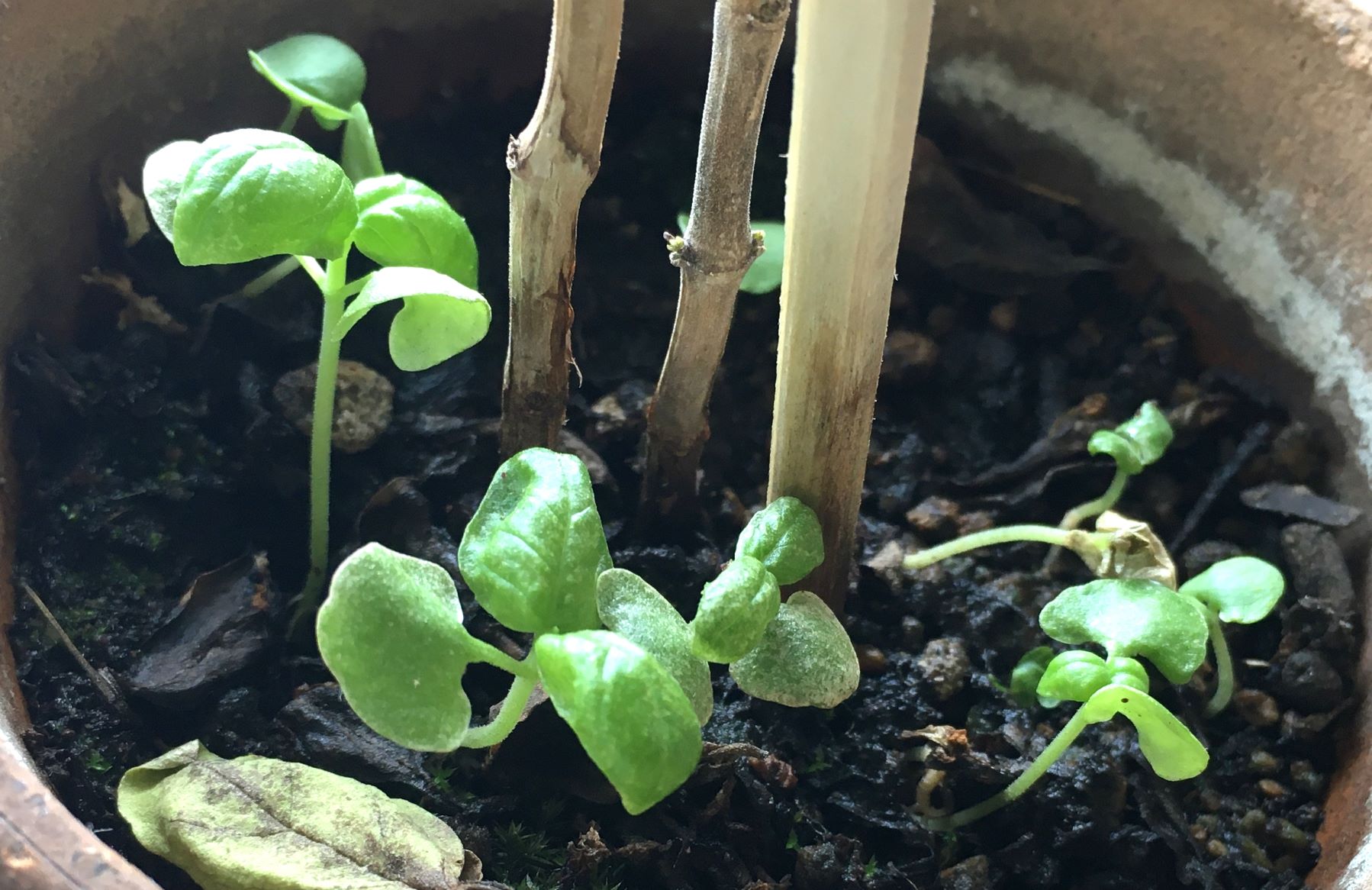 種子が取れたのでパラパラ蒔いたら新しい芽が出てきました。