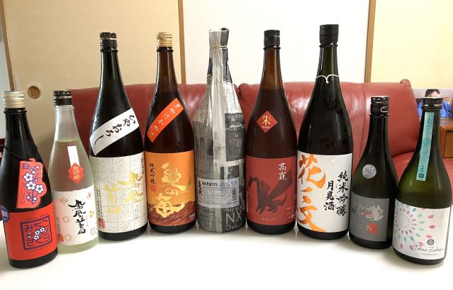 ※左から みちこざくら・鳳凰美田×2・亀の海・義侠・高麗・花ノ文・二兎・東魁盛
