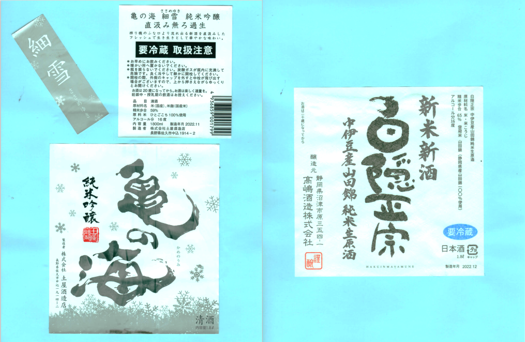 「酒の間」の土屋酒造店「亀の海」ラベルと高嶋酒造「白隠正宗」ラベルに追加しました。