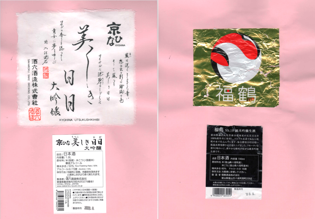 「酒の間」の酒六酒造「京ひな」ラベルと福鶴酒造「風の盆」ラベルに追加しました。