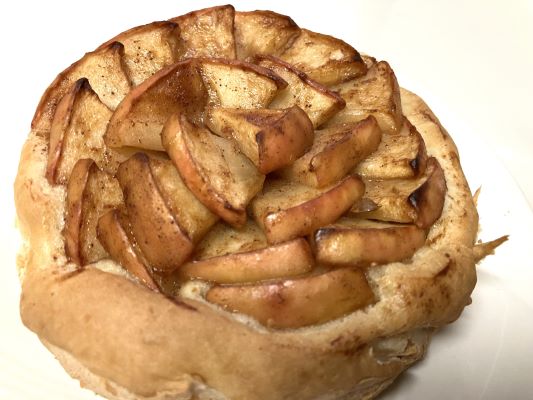 林檎は、豆乳・砂糖・シナモン・レモンで煮て生地に載せてオーブンで焼いたお菓子。