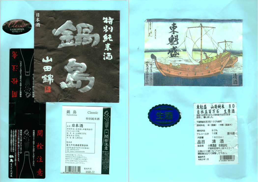 「酒の間」の富久千代酒造「鍋島」ラベルと小泉酒造「東魁盛」ラベルに追加しました。