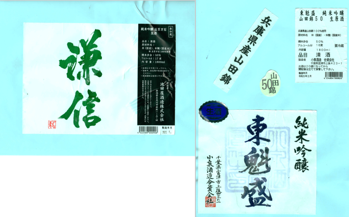 「酒の間」の池田屋酒造「謙信」ラベルと小泉酒造「東魁盛」ラベルに追加しました。