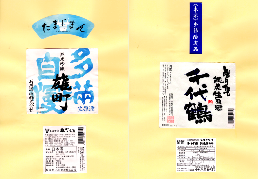 「酒の間」の石川酒造「多満自慢」ラベルと中村酒造「千代鶴」ラベルを追加しました。