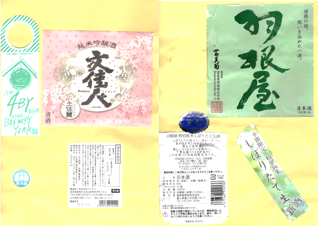 「酒の間」のアリサワ「文佳人」ラベルと富美菊酒造「羽根屋」ラベルに追加しました。