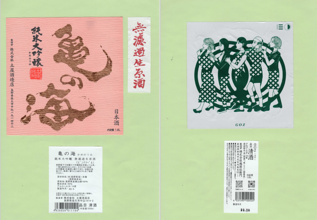 「酒の間」の土屋酒造店「亀の海」ラベルと越後伝衛門「環割」ラベルに追加しました。