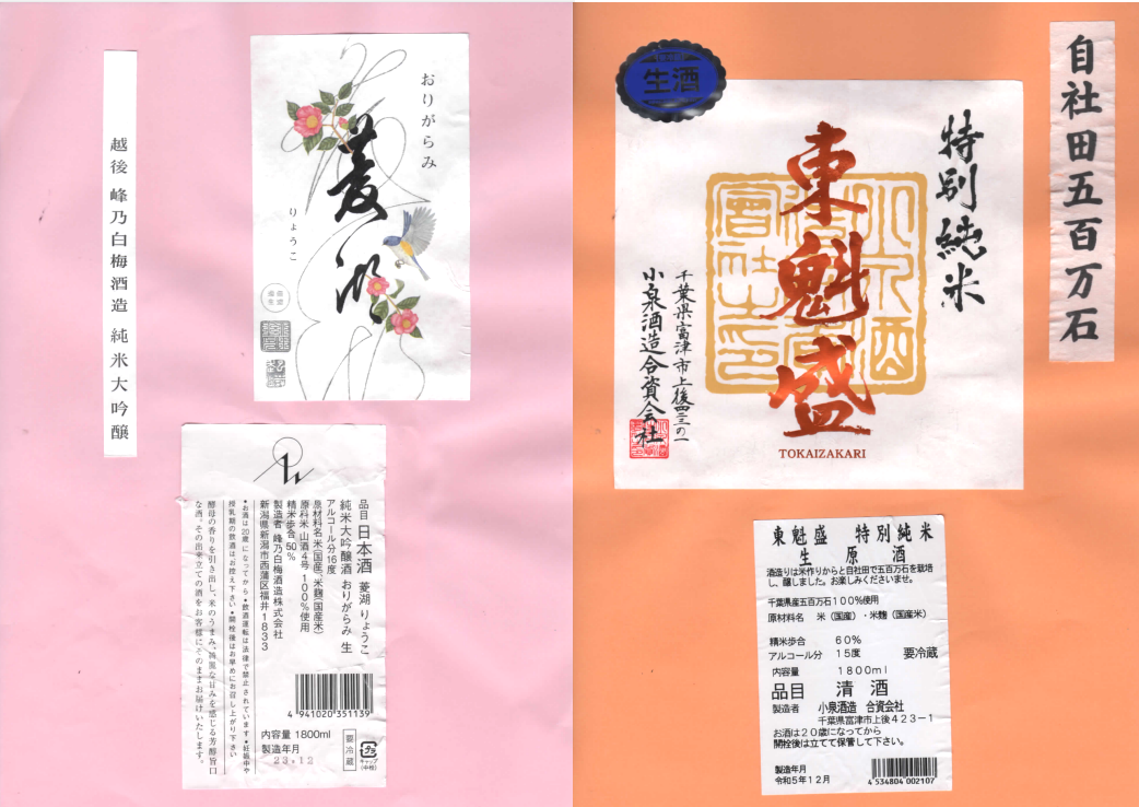 「酒の間」の峰乃白梅「峰乃白梅」ラベルと小泉酒造「東魁盛」ラベルに追加しました。