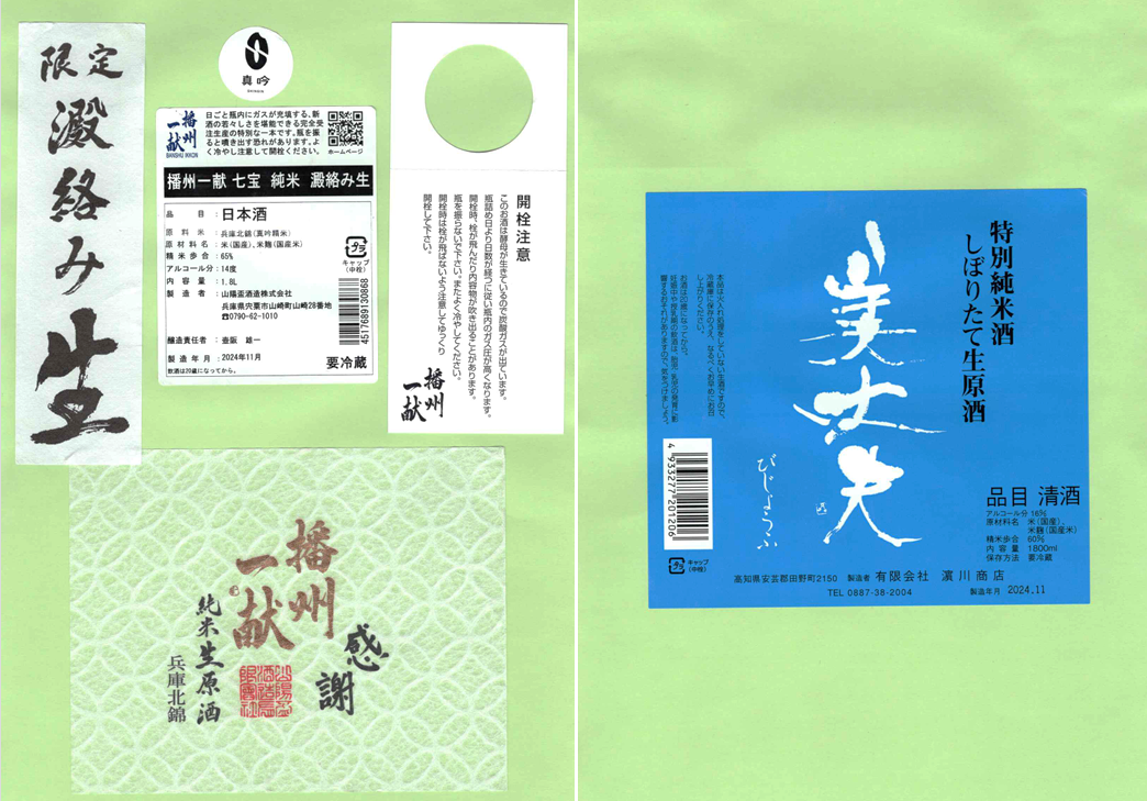 「酒の間」の山陽盃酒造「播州一献」ラベルと濱川商店「美丈夫」ラベルに追加しました。