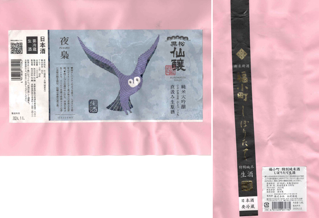 「酒の間」の仙醸「黒松仙醸」ラベルに追加、木村酒造「福小町」ラベルを追加しました。