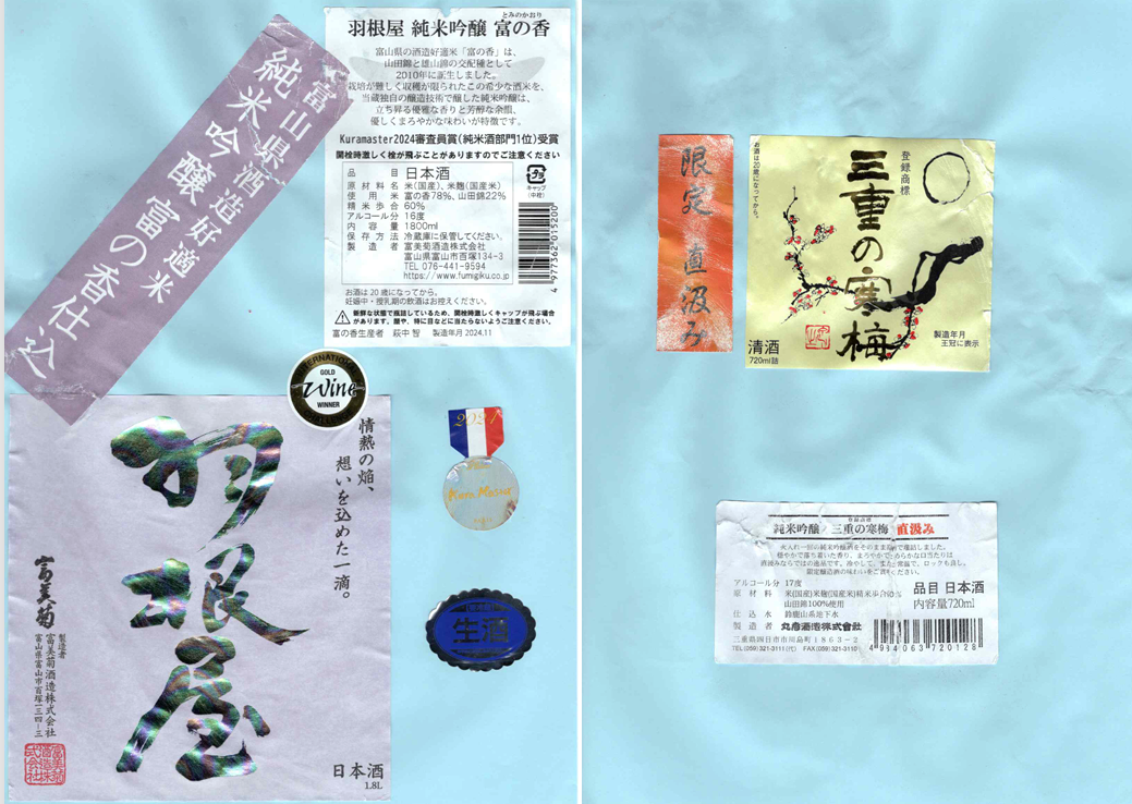 「酒の間」の富美菊酒造「羽根屋」ラベルに追加、丸彦酒造「三重の寒梅」ラベルを追加しました。