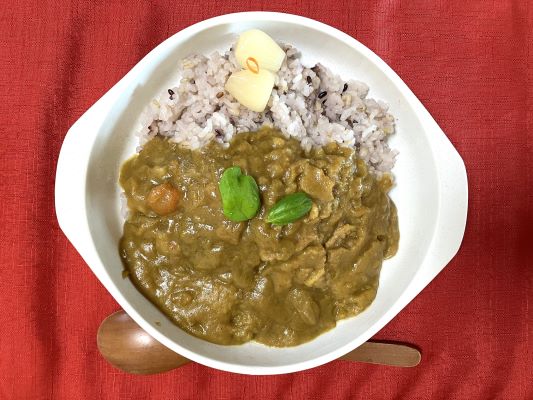 カレーはいつも道の駅などで手に入れた十穀米など混ぜて食べています。