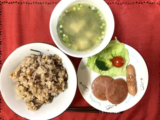 それだけだと甘いので、頂き物の佃煮2種を加えて。