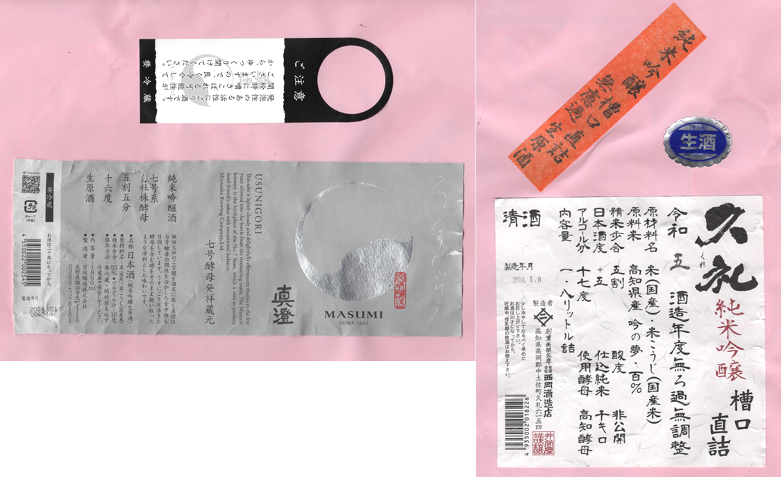 「酒の間」の宮坂醸造「真澄」ラベルと西岡酒造店「久礼」ラベルに追加しました。