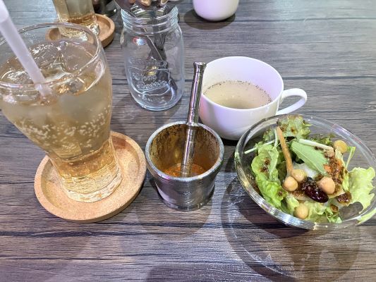 サラダやスープや飲み物が付きます。