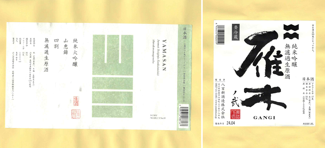 「酒の間」の山三酒造「山三」ラベルと八百新酒造「雁木」ラベルを追加しました。