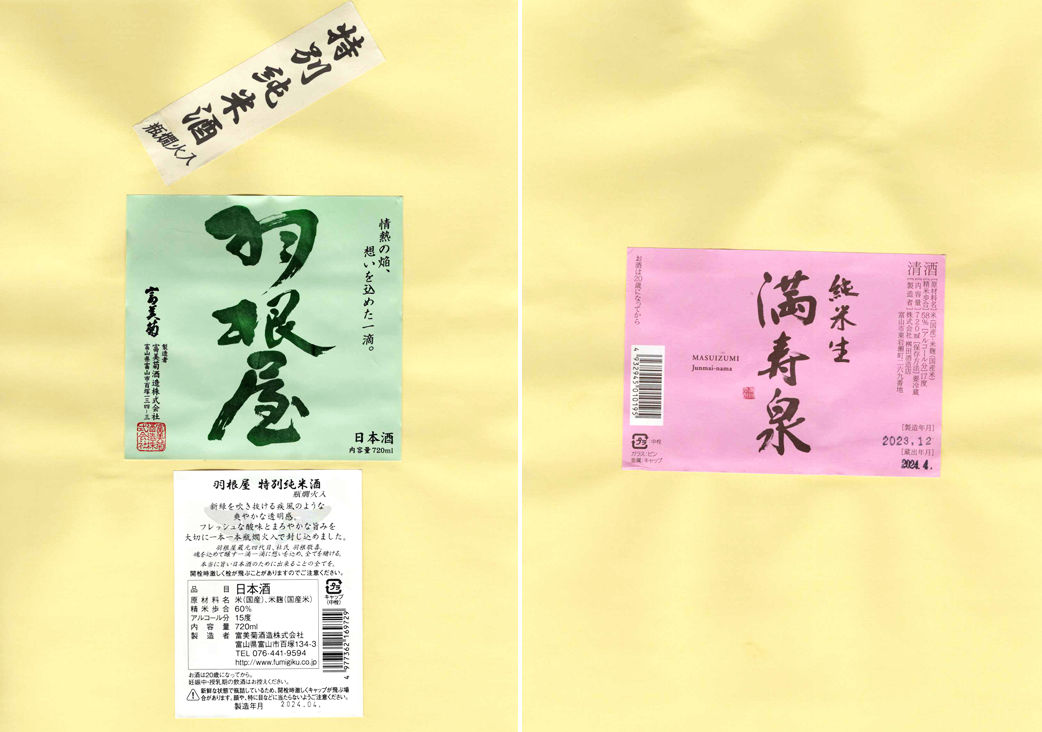 「酒の間」の富美菊酒造「羽根屋」ラベルと桝田酒造店「満寿泉」ラベルに追加しました。