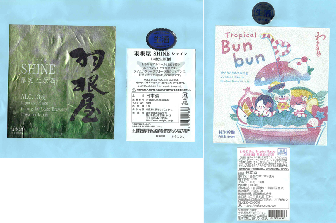「酒の間」の富美菊酒造「羽根屋」ラベルと新谷酒造「わかむすめ」ラベルに追加しました。
