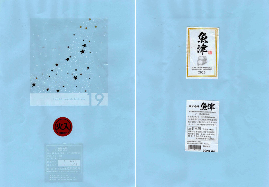 「酒の間」の尾澤酒造場「十九」ラベルと魚津酒造「北洋」ラベルに追加しました。