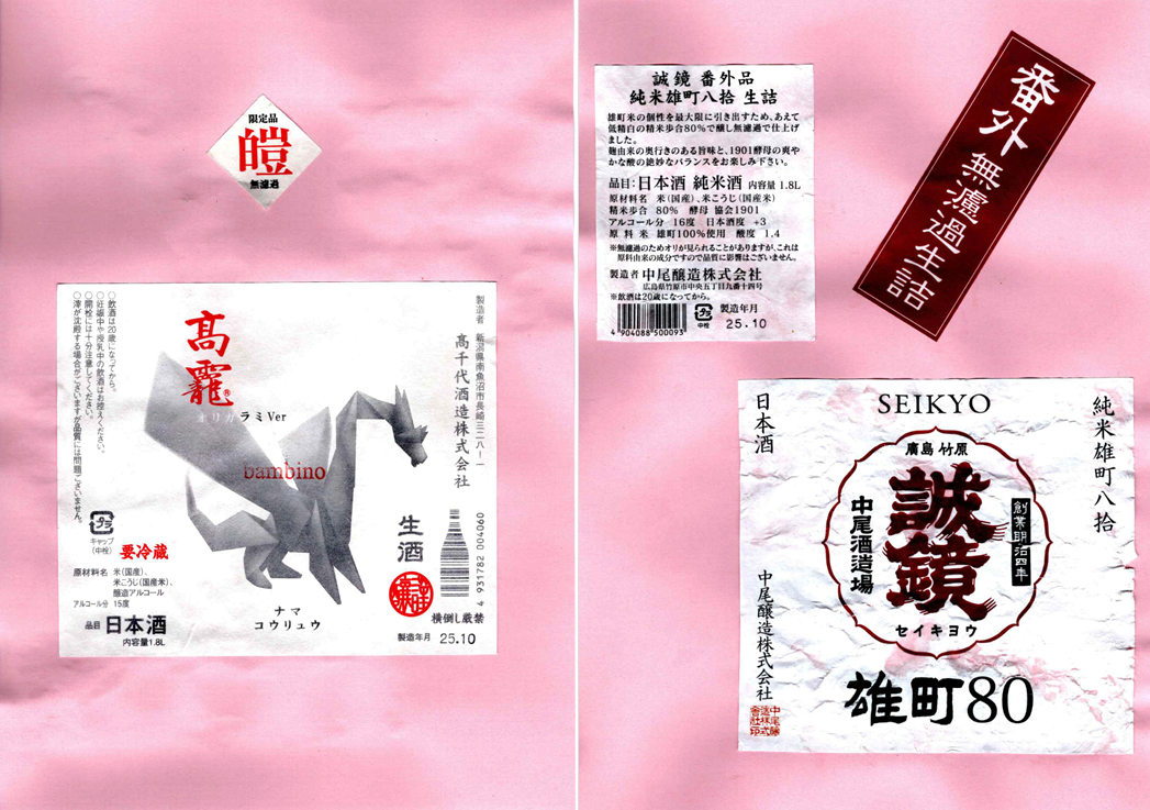 「酒の間」の高千代酒造「高千代」ラベルに追加、中尾醸造「誠鏡」ラベルを追加しました。