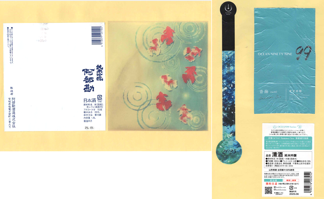 「酒の間」の阿部勘酒造「阿部勘」ラベルと寒菊銘醸「寒菊」ラベルに追加しました。