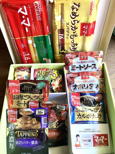 いつもはお好み焼きの粉とか天ぷら粉とかの粉ものが多いのですが、今回はパスタ中心のようです。