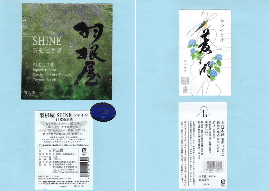 「酒の間」の富美菊酒造「羽根屋」ラベルと峰乃白梅酒造「峰乃白梅」ラベルに追加しました。