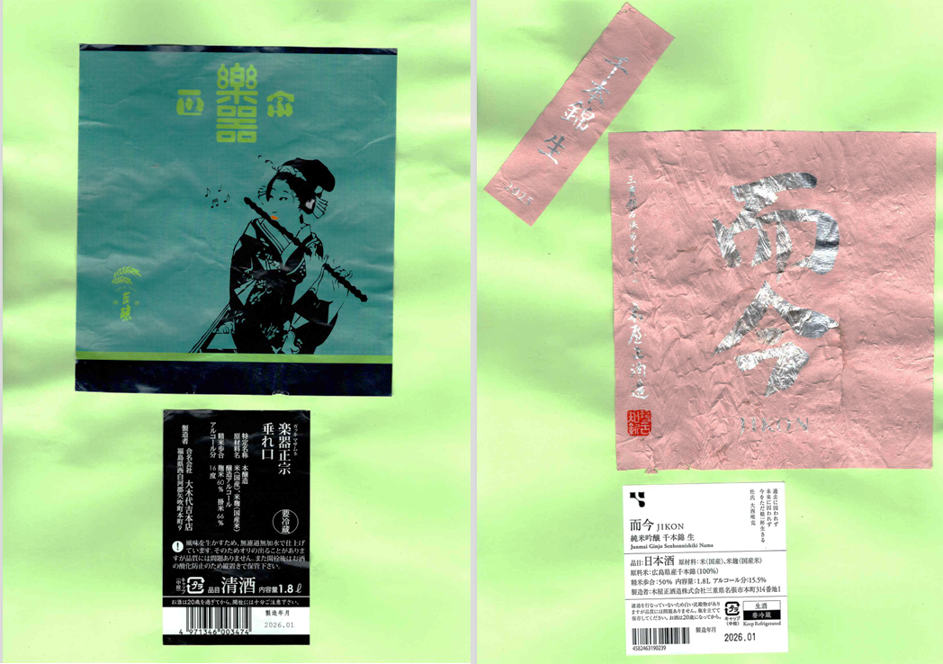 「酒の間」の大木代吉本店「自然郷」ラベルと木屋正酒造「而今」ラベルに追加しました。