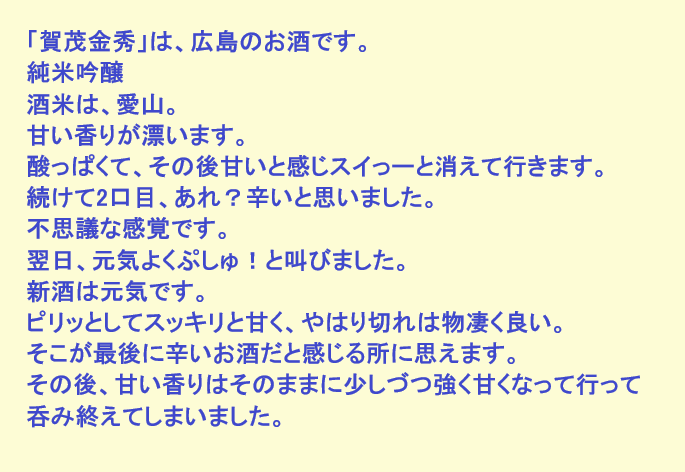 新しく開けたお酒:賀茂金秀(広島)